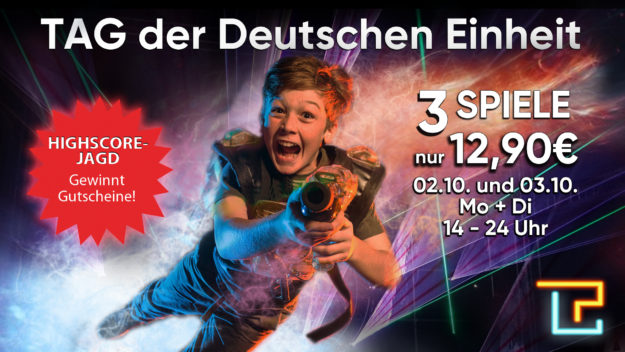 TAG Der Deutschen Einheit   2.10. & 3.10. (Mo. + Di.)  14 – 24 Uhr  Das Hammer Angebot im LASERPLEX   3 Runden LaserTag (45 Min.) für nur 12,90 € pro Person   Und mal wieder HIGHSCOREJAGD  Die Tages TOP-3 gewinnen tolle Preise: #1 – 1h Bowling für 6 Pers. inkl. Getränk bei Bowling World Düsseldorf #2 – 20…