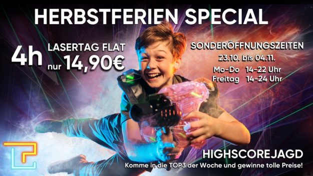 Herbstspecial im LASERPLEX   4h LaserTag FLATRATE nur 14,90 €*   Mo. – Fr. vom 23.10. – 03.11. (außer 31.10. )  Entweder 14 – 18 Uhr o. 18 – 22 Uhr  HIGHSCOREJAGD**  Die Wochen TOP-3 pro Woche gewinnen tolle Preise: #1 – 1 Stunde Bowling für 6 Pers. inkl. Softdrink bei Bowling World Düsseldorf #2 – 1 Stunde…