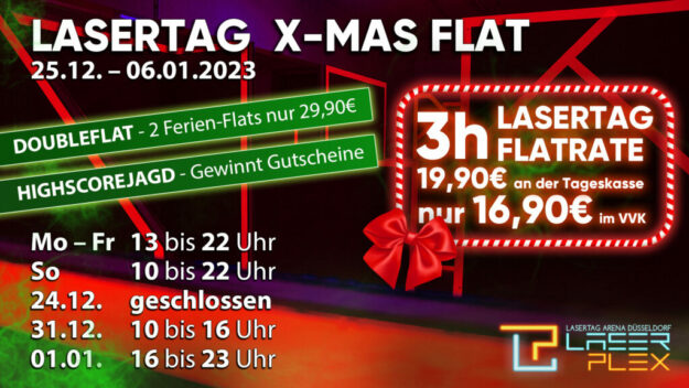 𝐗𝐌𝐀𝐒 𝙞𝙢 𝙇𝘼𝙎𝙀𝙍𝙋𝙇𝙀𝙓 𝟑𝐡 𝐋𝐚𝐬𝐞𝐫𝐓𝐚𝐠 𝐅𝐥𝐚𝐭𝐫𝐚𝐭𝐞 𝐧𝐮𝐫 𝟏6,𝟗𝟎 €* im VVK 19,90 € an der Tageskasse 25.12. – 6.1.23 (die ganzen Weihnachtsferien außer Samstags).13–16 Uhr ; 16–19 Uhr ; 19–22 Uhr (Sonntags auch 10-13 Uhr) #GEILISTGEIZ 𝐃𝐨𝐮𝐛𝐥𝐞-𝐅𝐥𝐚𝐭 2 Ferien-Flats für nur 29,90 € p.P. auch an verschiedenen Tagen einlösbar Jede Woche #HIGHSCOREJAGD** Die 𝐖𝐨𝐜𝐡𝐞𝐧 𝐓𝐨𝐩-𝟑…