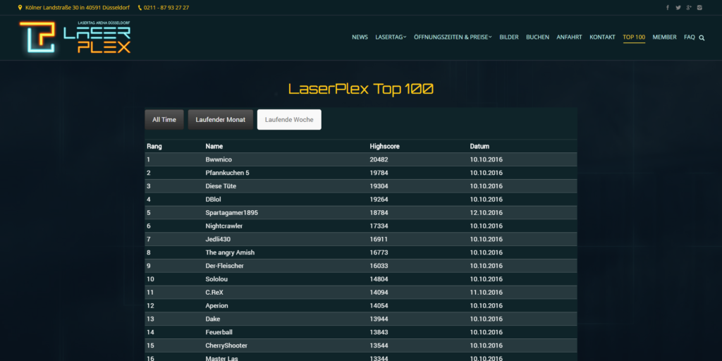 Ganz neu auf unserer Website … der Arena-Highscore (LASERPLEX Top 100) in Echtzeit unter www.laserplex-duesseldorf.de/top-100/